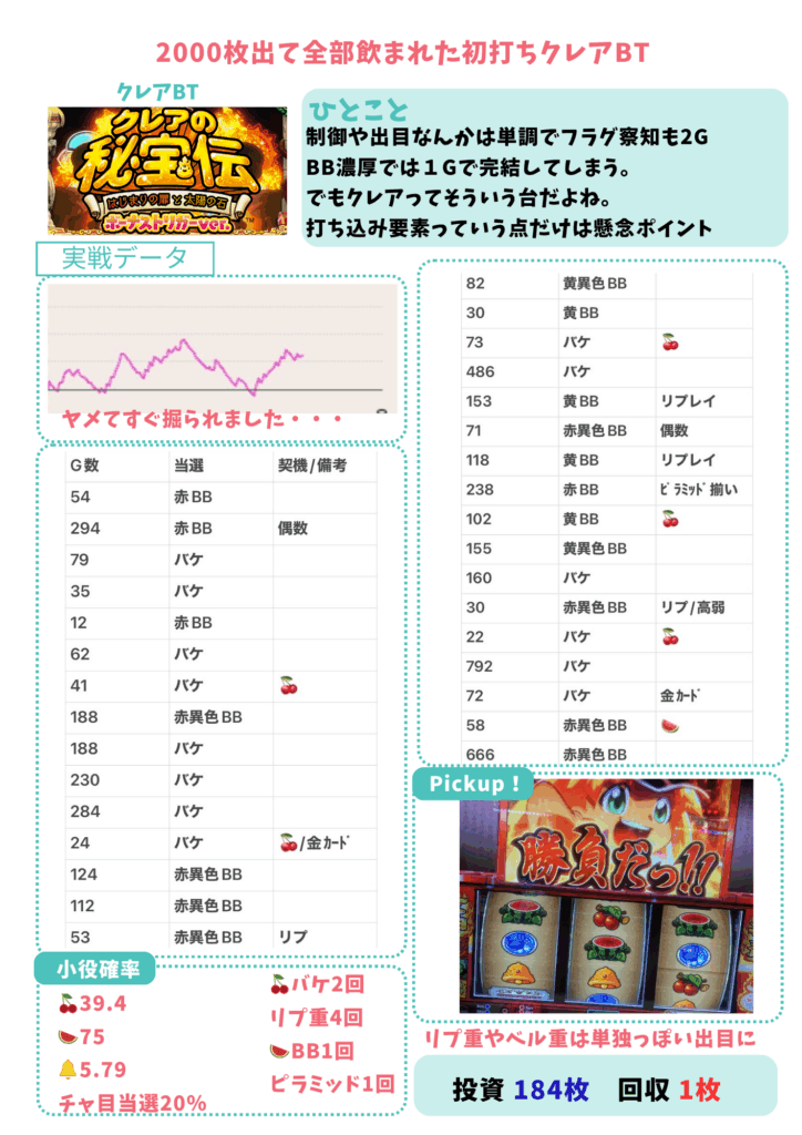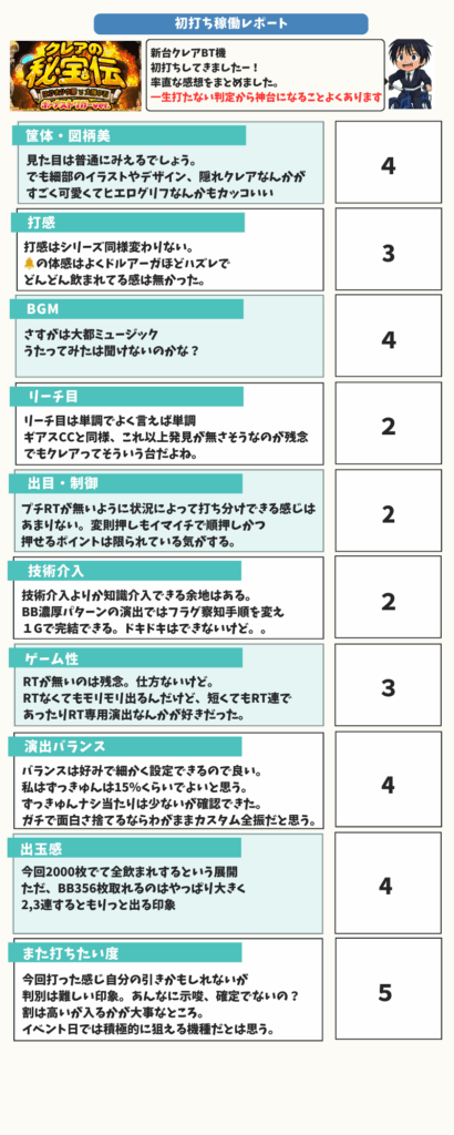 新台 クレアの秘宝伝BT 初打ちレポ